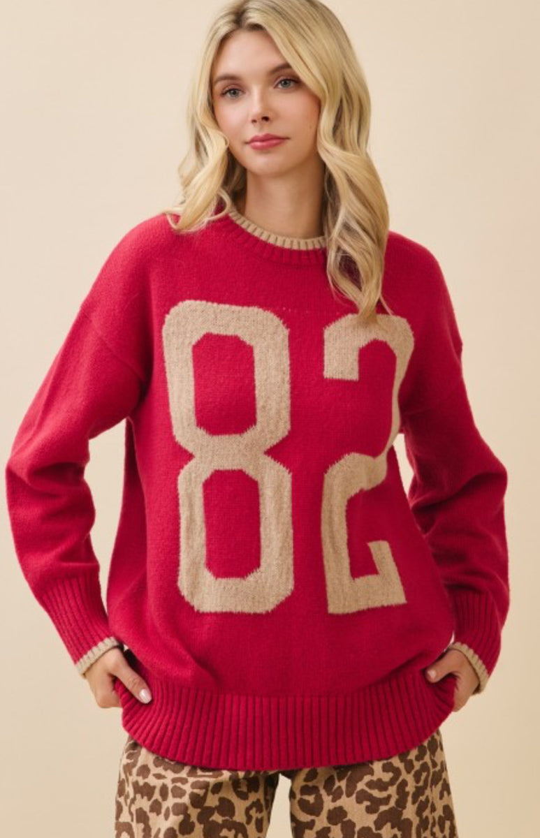 Stay cozy and stylish with our Red Pullover Sweater. Featuring a bold 82 graphic, this sweater fits true to size for the perfect fit. Keep warm and make a statement with this must-have piece.