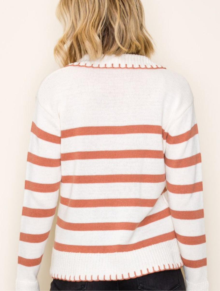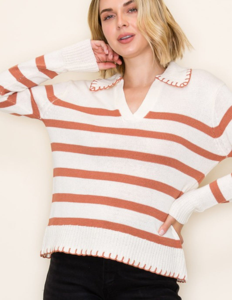 Elevate your sweater game with this chic Ivory and Orange Stripe and Stitch Sweater. The perfect combination of style and comfort, this sweater is designed to fit true to size. Don't miss out on this must-have addition to your wardrobe.