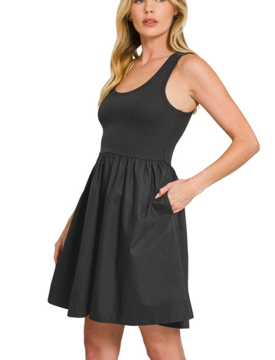 The 7372 is a stylish black tank dress featuring convenient side pockets. Its simple design offers comfort and versatility, making it perfect for casual outings or relaxed weekends. Enjoy the ease of carrying essentials while looking effortlessly chic.