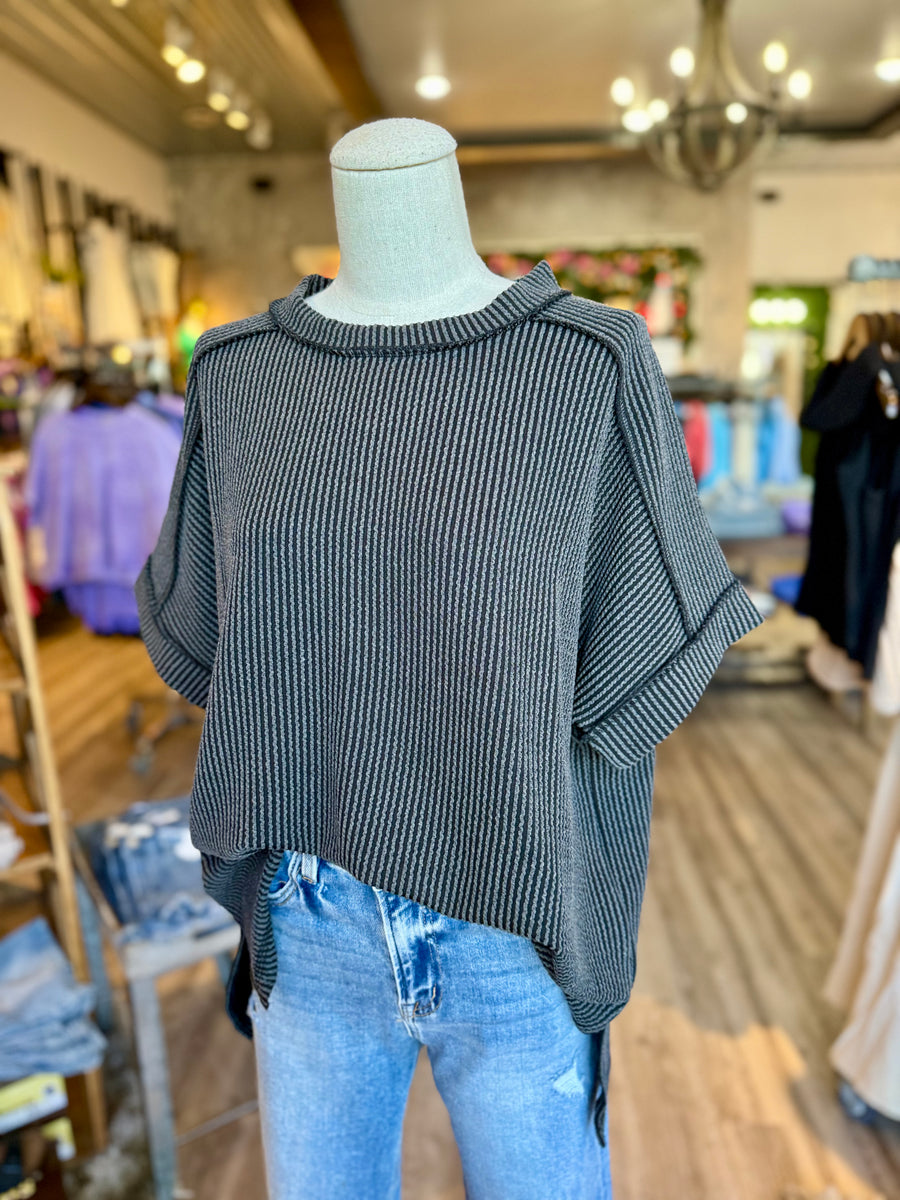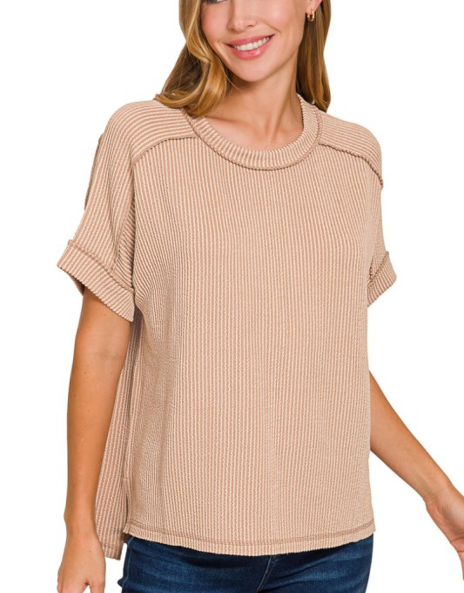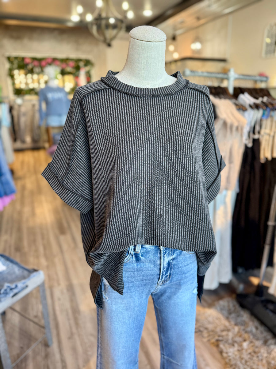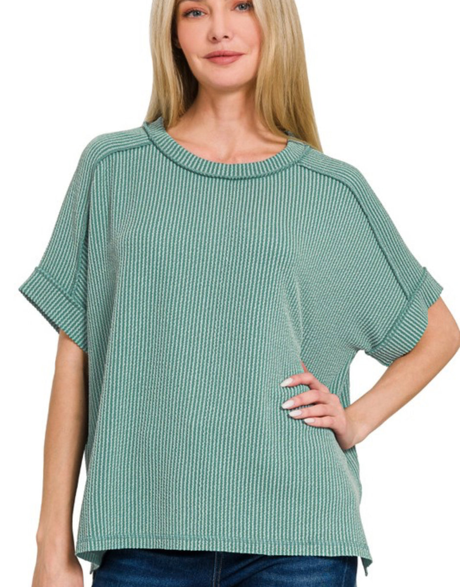 Corded ribbed short cuff sleeve raw edge top. Relaxed fit.