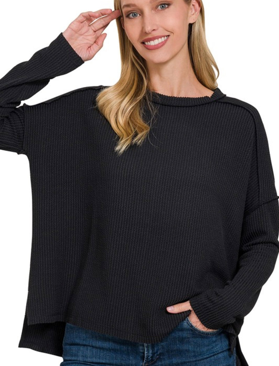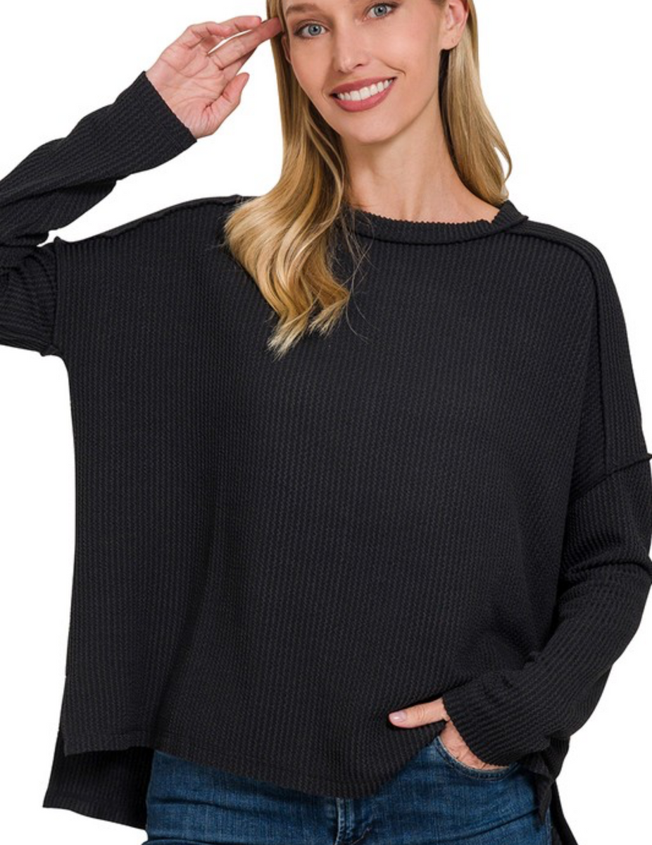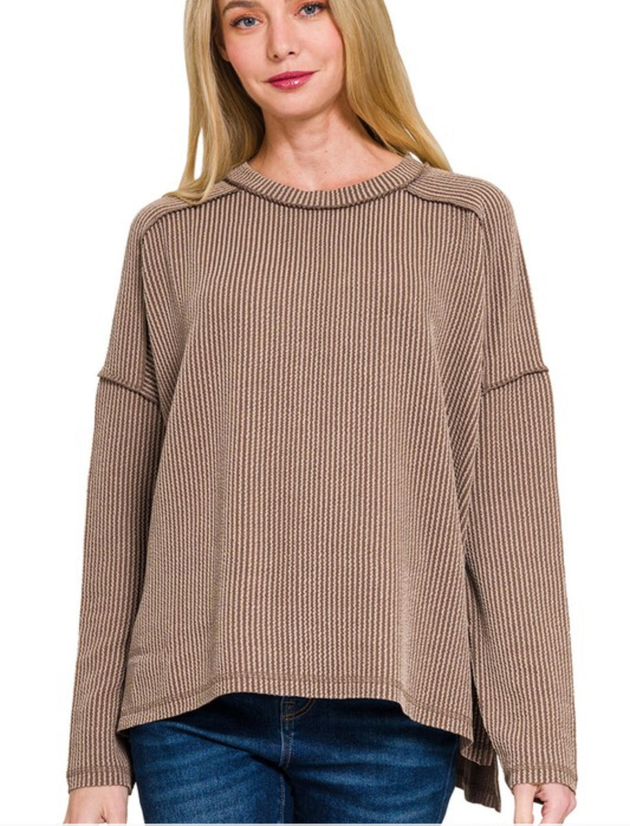Effortlessly stylish, 8452 is the perfect addition to any wardrobe. With a relaxed fit and brown and black ribbed long sleeve, this top provides both comfort and a chic look. Stay comfortable and fashionable all day long with this versatile piece.