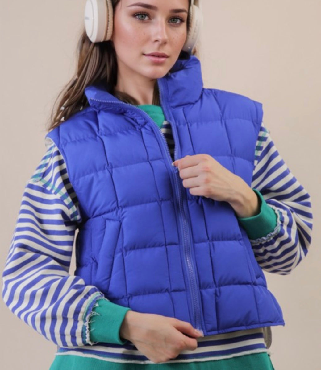 Stay warm and stylish with our Royal Blue quilted puffer vest. Its cozy design will keep you comfortable while the vibrant color adds a touch of luxury to your look. Perfect for chilly weather and versatile for any occasion.