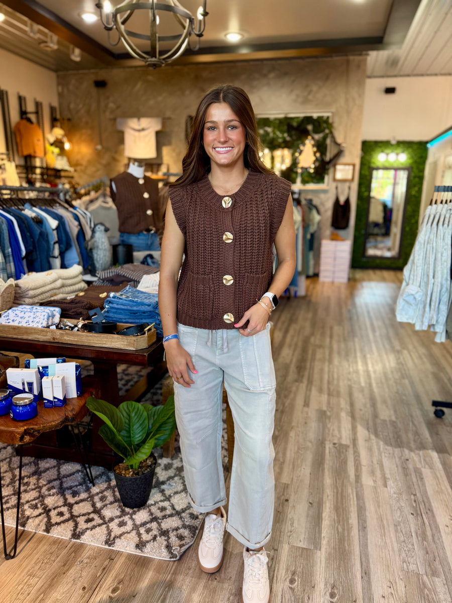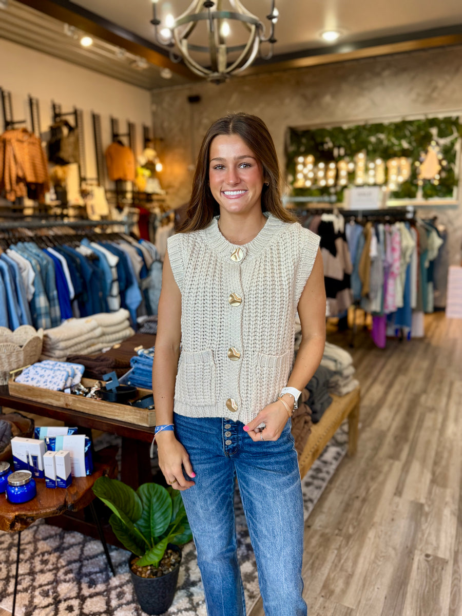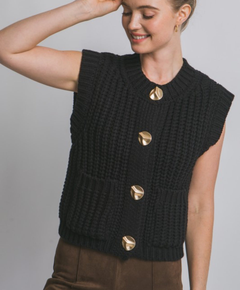 This versatile sweater vest comes in ivory, brown, or black and is designed with a chunky knit and gold buttons. Perfect for layering over any outfit, it adds a touch of sophistication while keeping you warm and cozy. A must-have for any wardrobe.