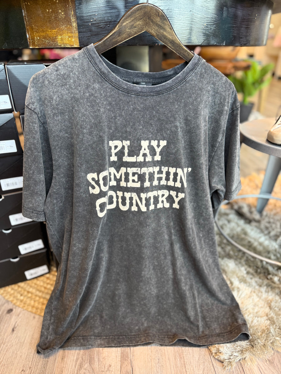 This black mineral wash graphic tee features a relaxed fit and a fun "Play Something Country" design. Stay comfortable and stylish while showing off your love for country music.