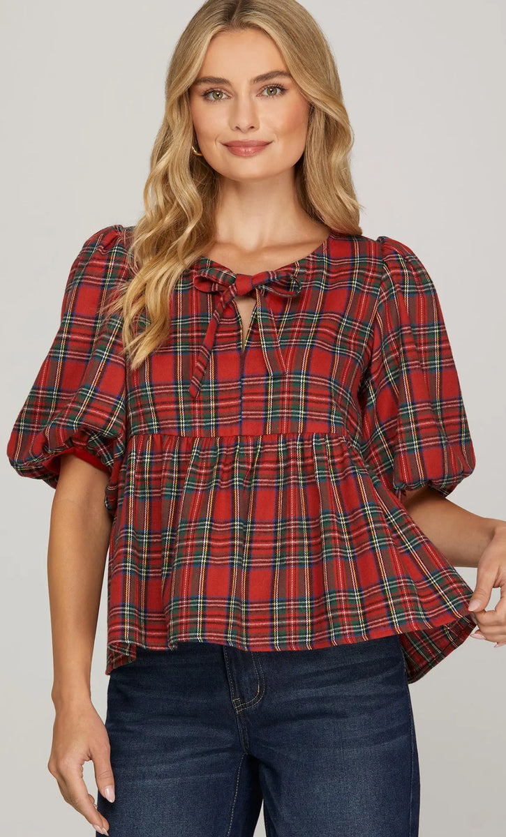 Effortlessly chic, the 9629 babydoll top features a festive red Christmas plaid design and a front tie for a flattering fit. Made to fit true to size, this top is the perfect addition to your holiday wardrobe.