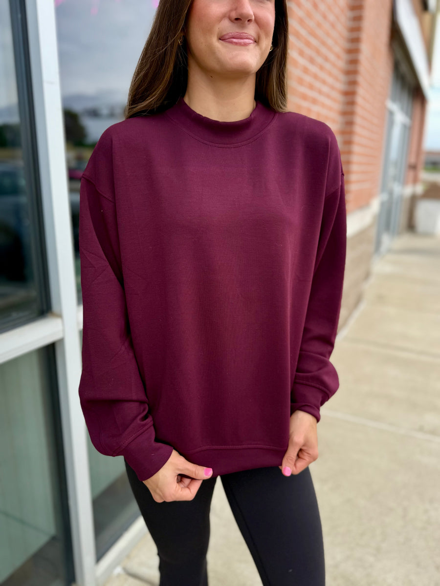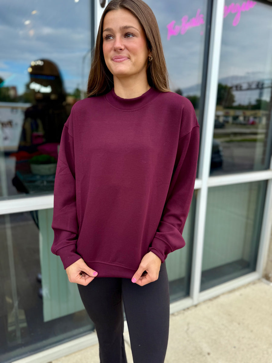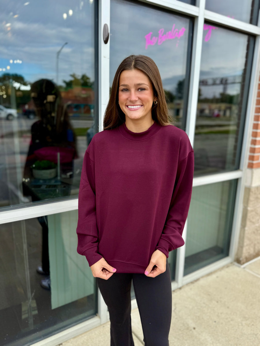 Introducing the 9957 Dark Cherry Scuba Pullover, a must-have for cozy comfort! Made from super soft material, this crew neck top is perfect for any occasion. Stay warm and stylish in this dark cherry color.