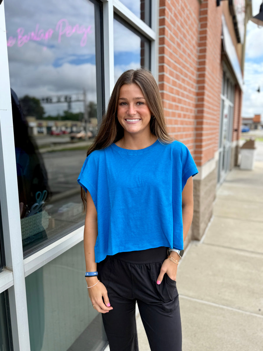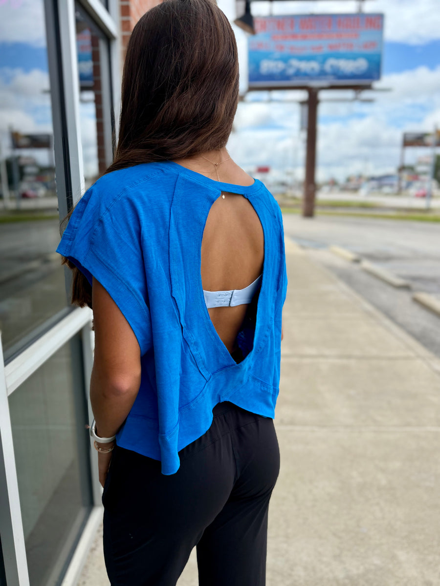 Get the same breezy vibes with our Ocean Blue Open Back Top! A perfect dupe for Free People, it features an open back for that effortless style. Rock it at the beach or brunch and channel your inner bohemian goddess. Model pictured in size small.