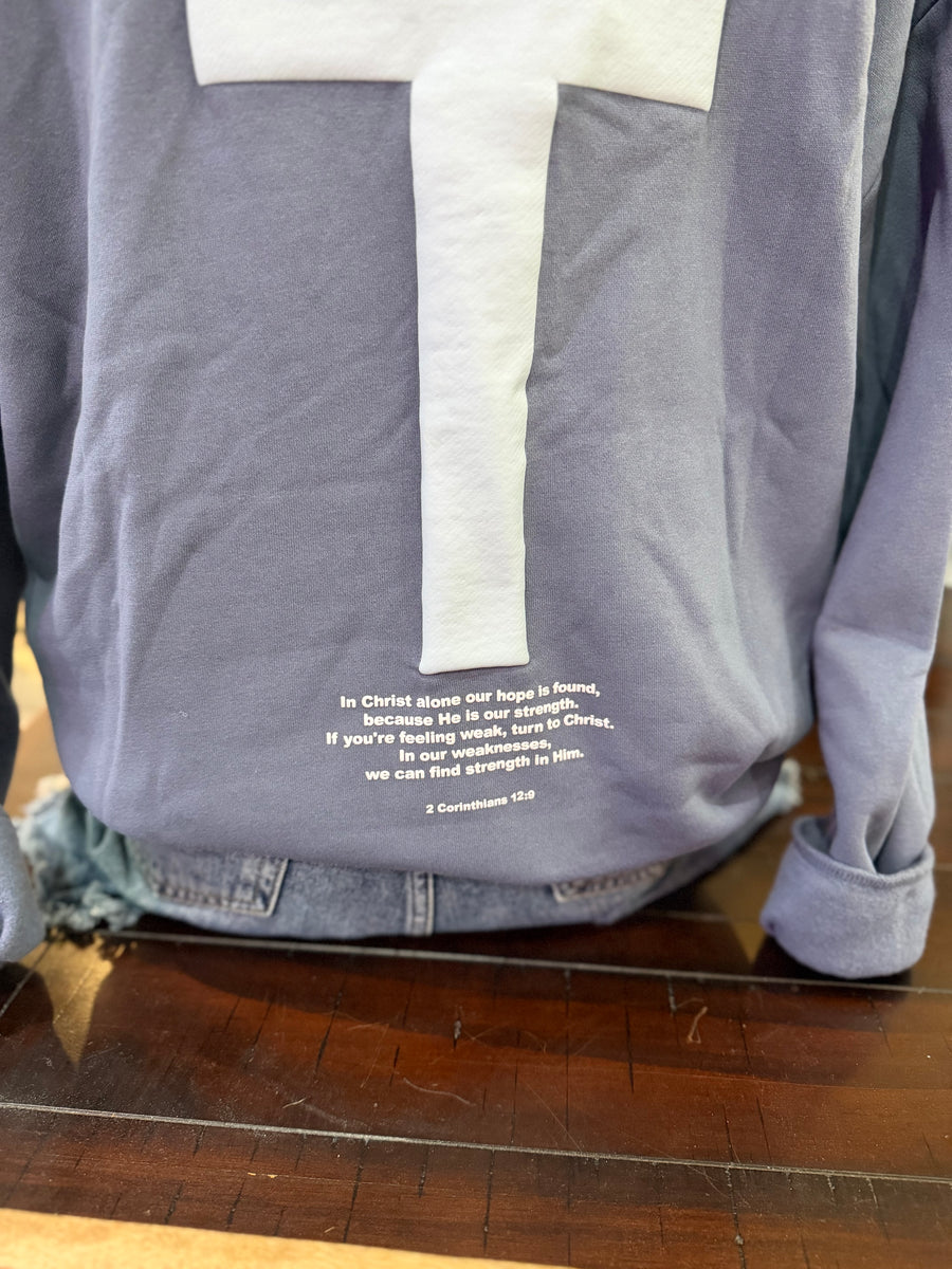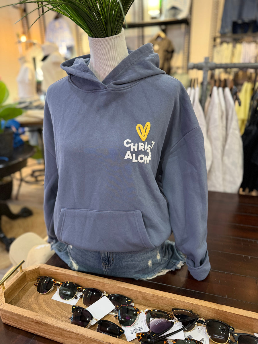 The Christ Alone hoodie features a denim blue cross design on the front and back. Its relaxed loose fit provides comfort, making it perfect for everyday wear while showcasing your faith. This stylish hoodie is a perfect addition to your wardrobe.