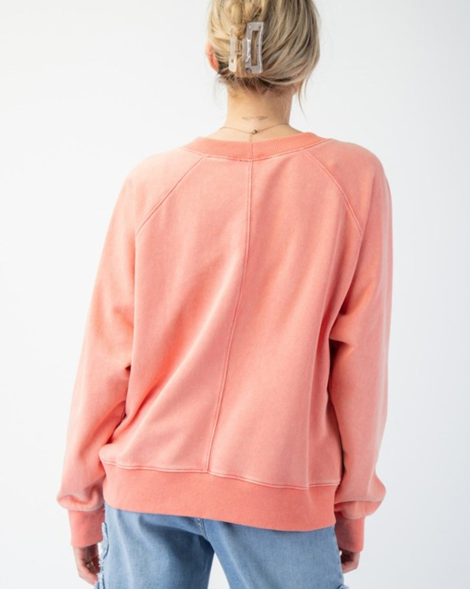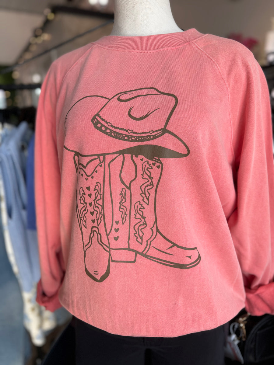 Kick up your casual style with our Coral Boots! Made of mineral washed terry fabric, this relaxed-fit sweatshirt features a quirky cowboy boot graphic. A fun and playful addition to any wardrobe.