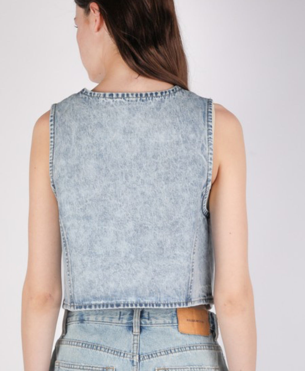 This denim front tie vest is the perfect addition to your wardrobe. Made with high-quality denim that fits true to size, it offers both style and comfort. Elevate any outfit with the trendy and versatile front tie design.