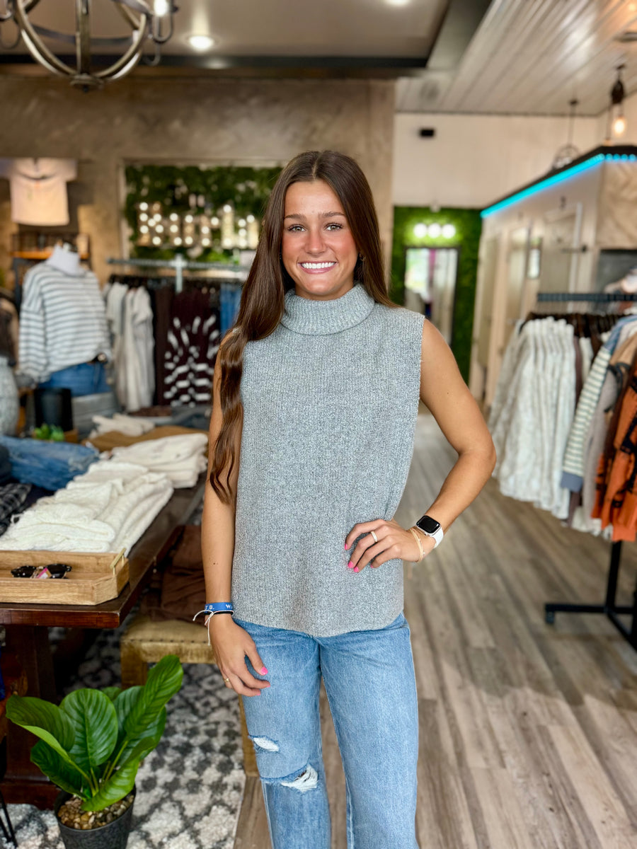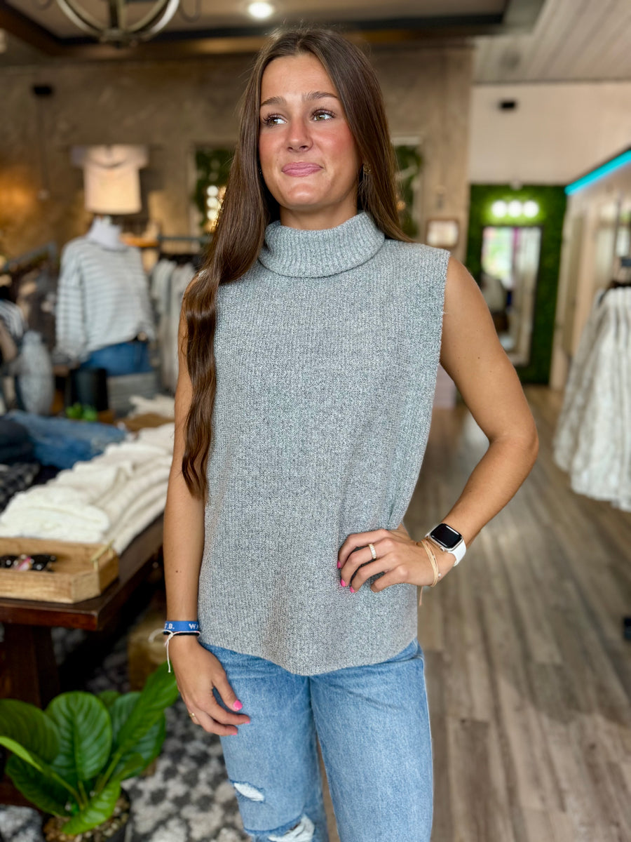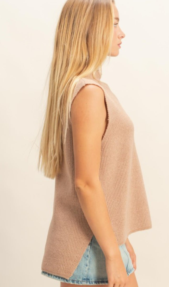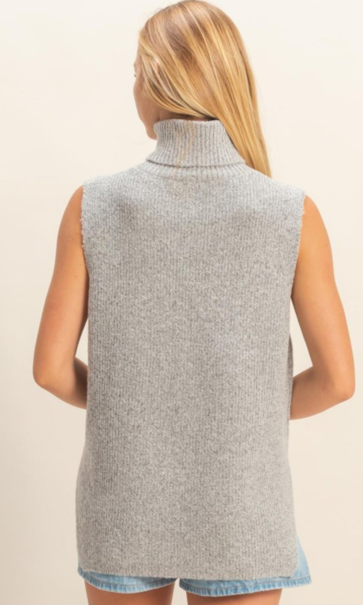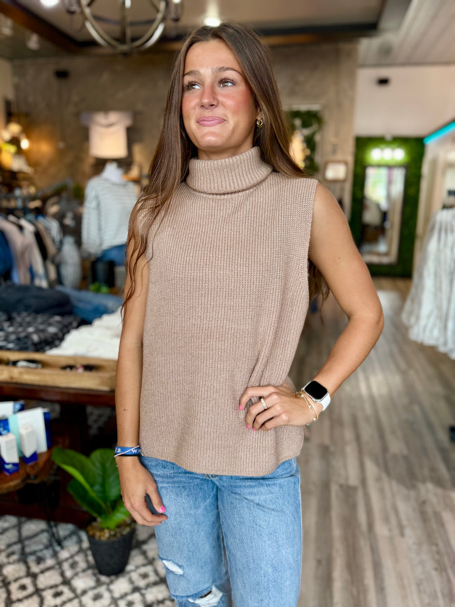 Stay cozy and stylish with our E157 sleeveless turtleneck sweater. Choose from two classic colors, tan and gray. Perfect for any occasion, this sweater will keep you warm and on-trend.
