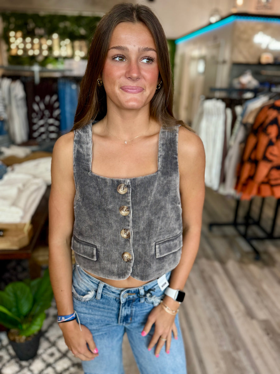 Add some texture and charm to your outfit with our E613 Charcoal Corduroy Button Vest. Its soft corduroy material and classic button design make it a versatile and stylish addition to your wardrobe. Perfect for layering or adding a touch of sophistication to any look.