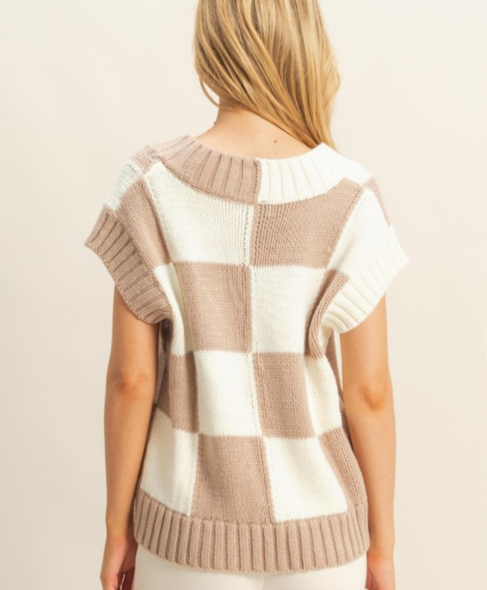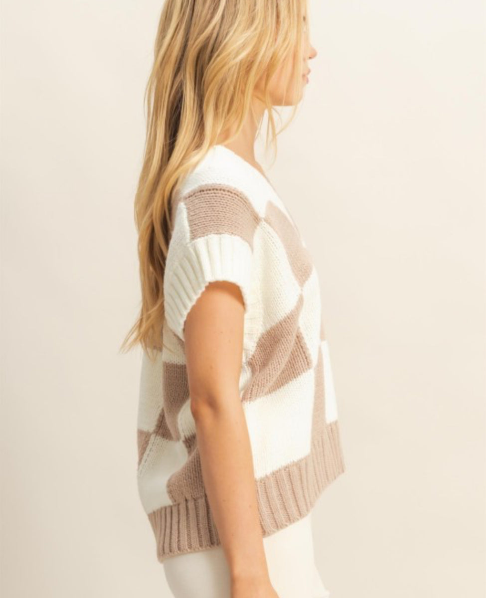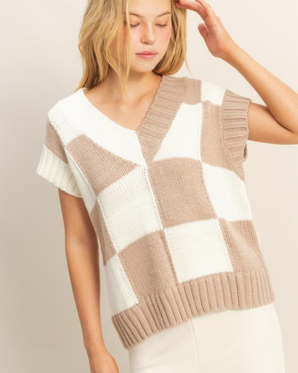 Stay stylish and cozy with our tan and ivory checkered v neck vest, perfect for any occasion. Complement your outfit with a touch of elegance and comfort.