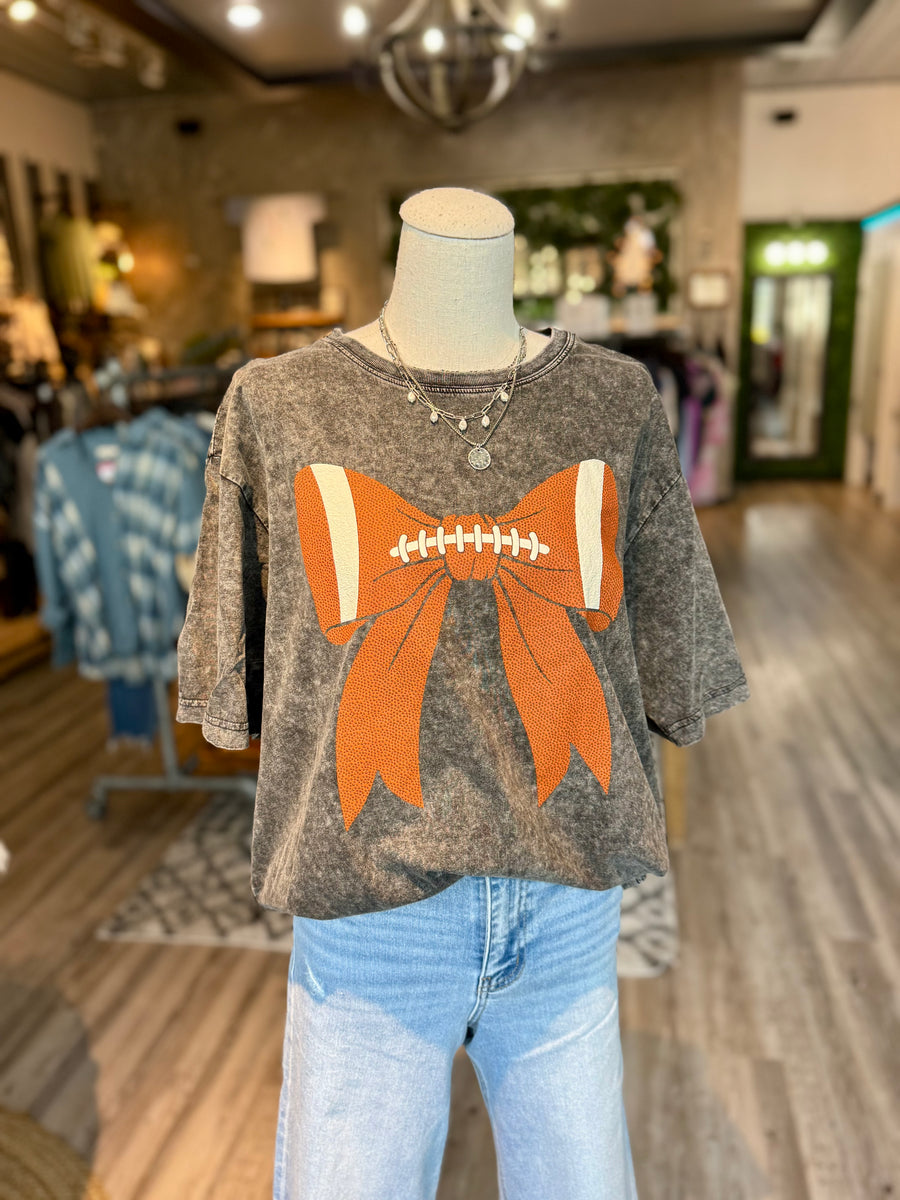 Introducing our Football Bow tee! This stylish shirt features a black mineral wash and puff print football bow graphic, perfect for any football fan. Made with high-quality materials, you can show off your love for the game in comfort and style. Score a touchdown with this must-have tee.
