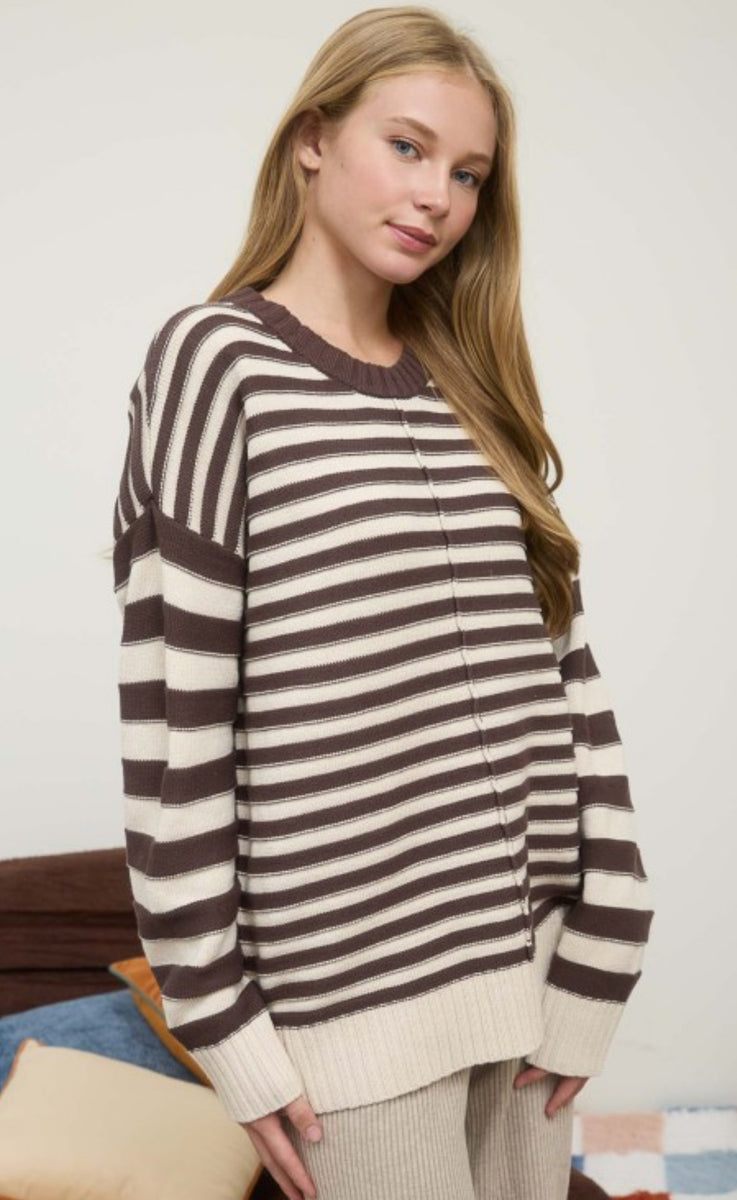 Stay cozy and stylish with our Ft1027 brown stripe pullover sweater. This fashionable sweater is perfect for colder days, keeping you warm while also making a statement. Its brown stripe design adds a touch of sophistication to any outfit. Elevate your wardrobe with this must-have piece.