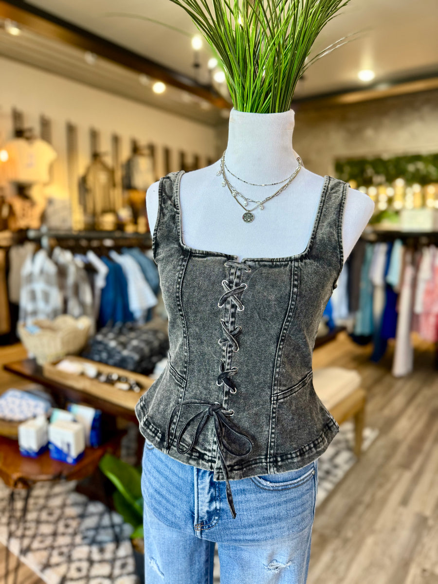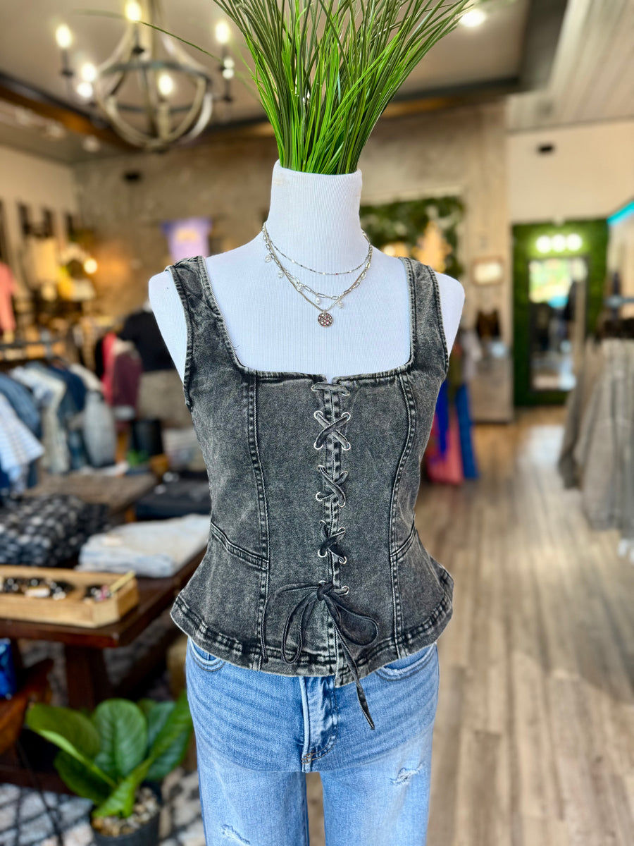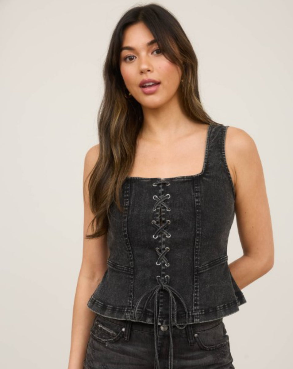 Effortlessly cool in this black denim lace up tank top. Stay stylish and comfortable with the lace up design while adding a touch of edge to any outfit. Perfect for everyday wear or a night out on the town. Stay chic with Tw1926.
