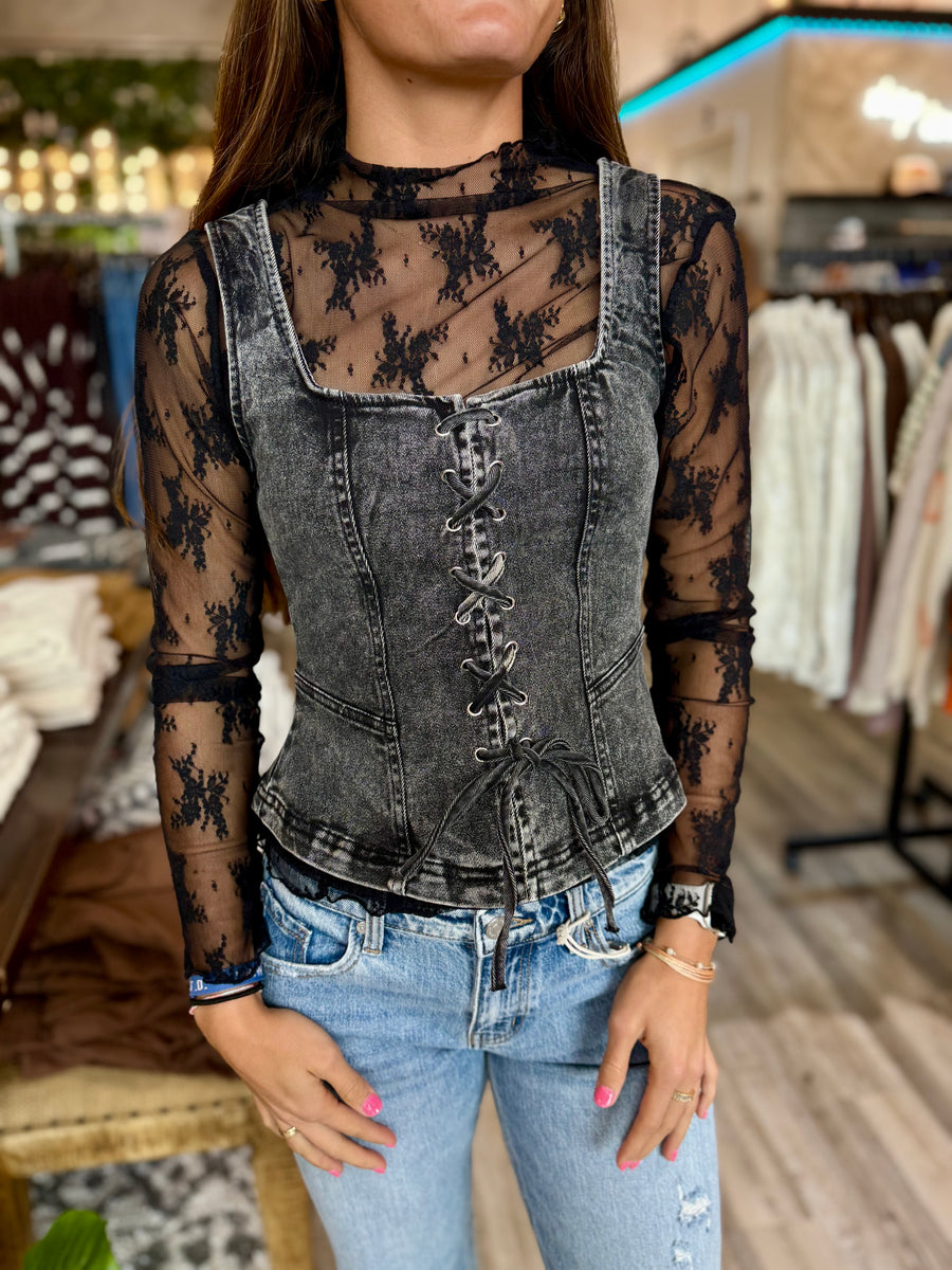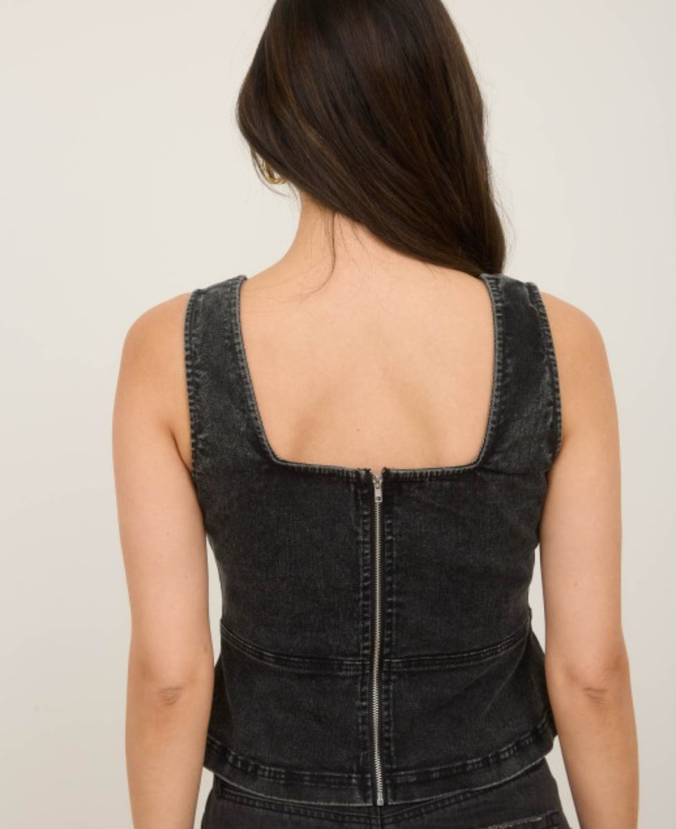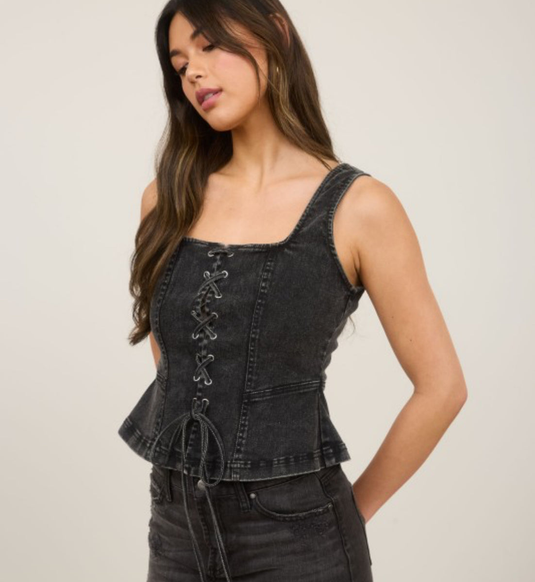 Effortlessly cool in this black denim lace up tank top. Stay stylish and comfortable with the lace up design while adding a touch of edge to any outfit. Perfect for everyday wear or a night out on the town. Stay chic with Tw1926.