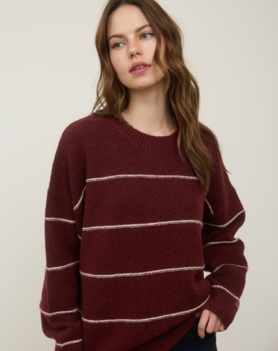 Stay warm and stylish in our Tw1976 dark red stripe sweater. Designed to fit you perfectly, this sweater will keep you cozy while making a statement. Find the perfect balance of comfort and fashion with this must-have piece.