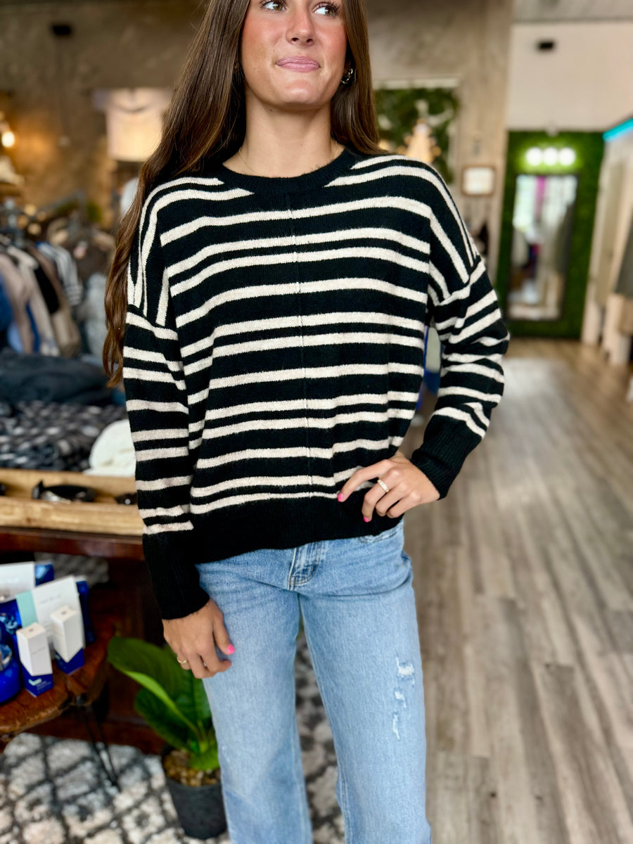 Stay cozy and stylish with our W2059 pullover sweater. Its black color and tan stripes add a touch of sophistication to any outfit. Perfect for chilly days, this sweater is a wardrobe essential.