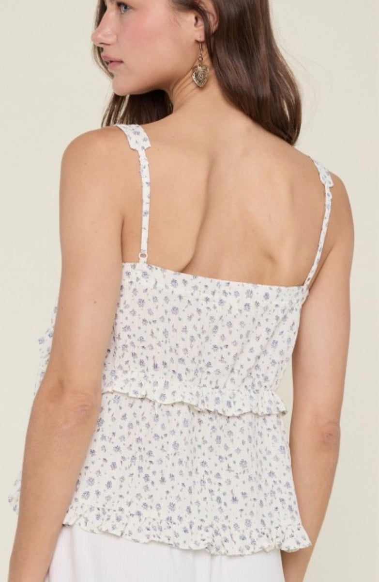 The 12288 ivory adjustable tank features a charming blue floral design, perfect for adding a touch of elegance to your outfit. Its adjustable straps ensure a comfortable fit, making it a versatile choice for any occasion.