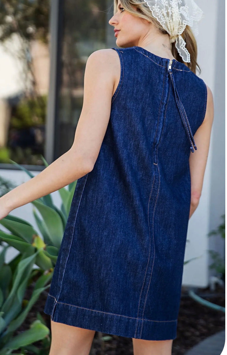 Embrace effortless style with the 14525 dark denim shift dress. Featuring a convenient back zipper, this dress offers easy wear and a flattering silhouette, making it perfect for a casual day out or a relaxed evening. It's a versatile addition to your wardrobe.