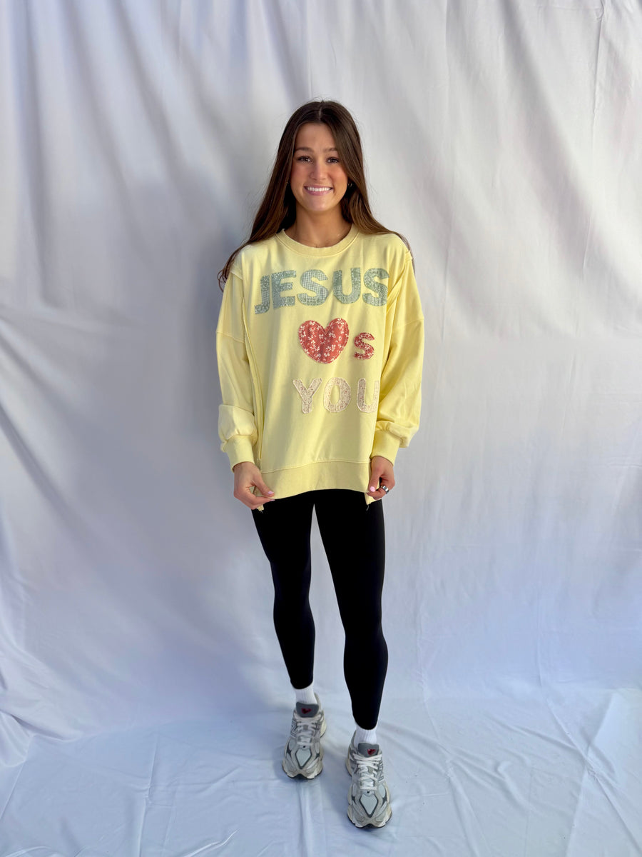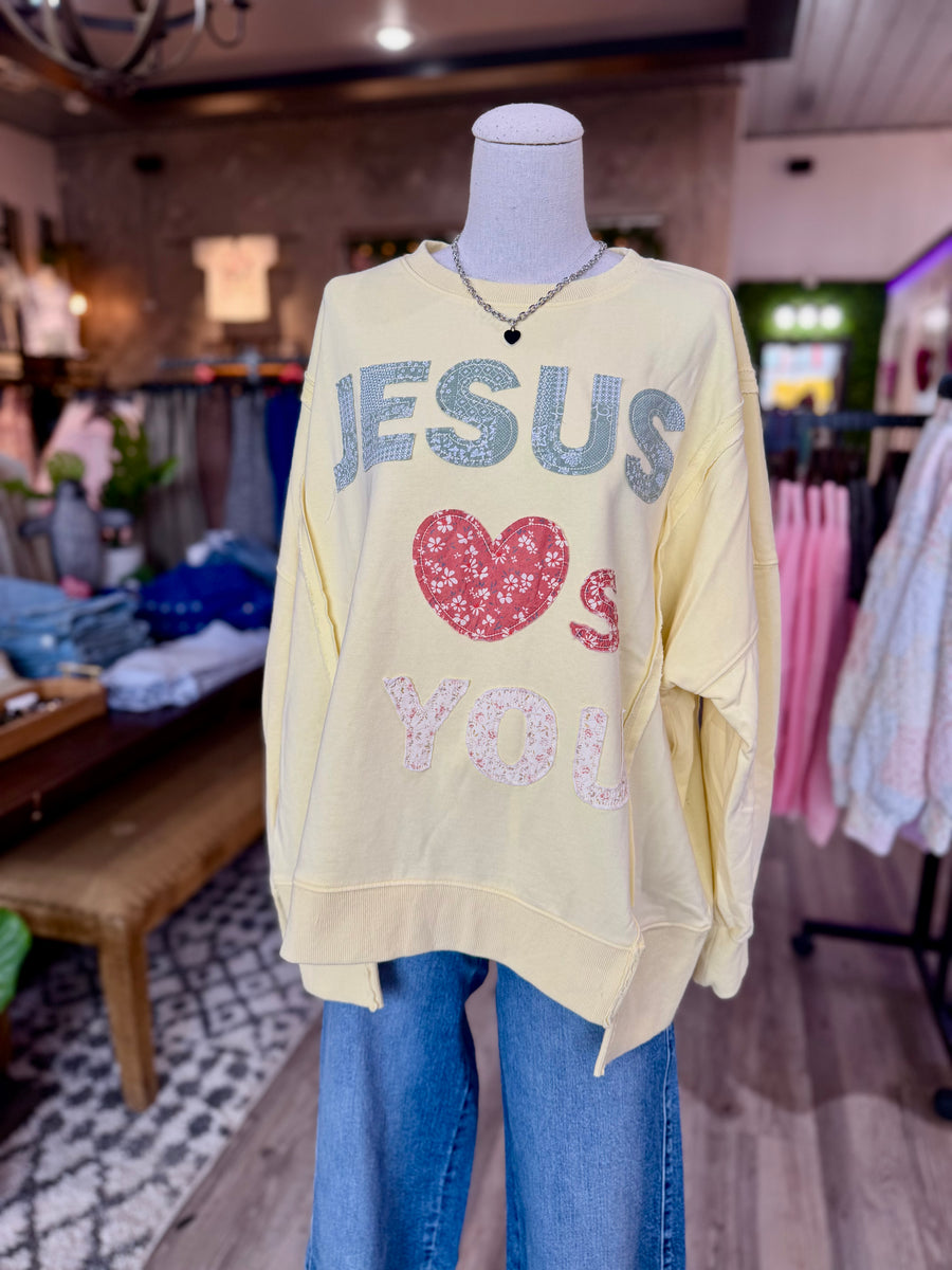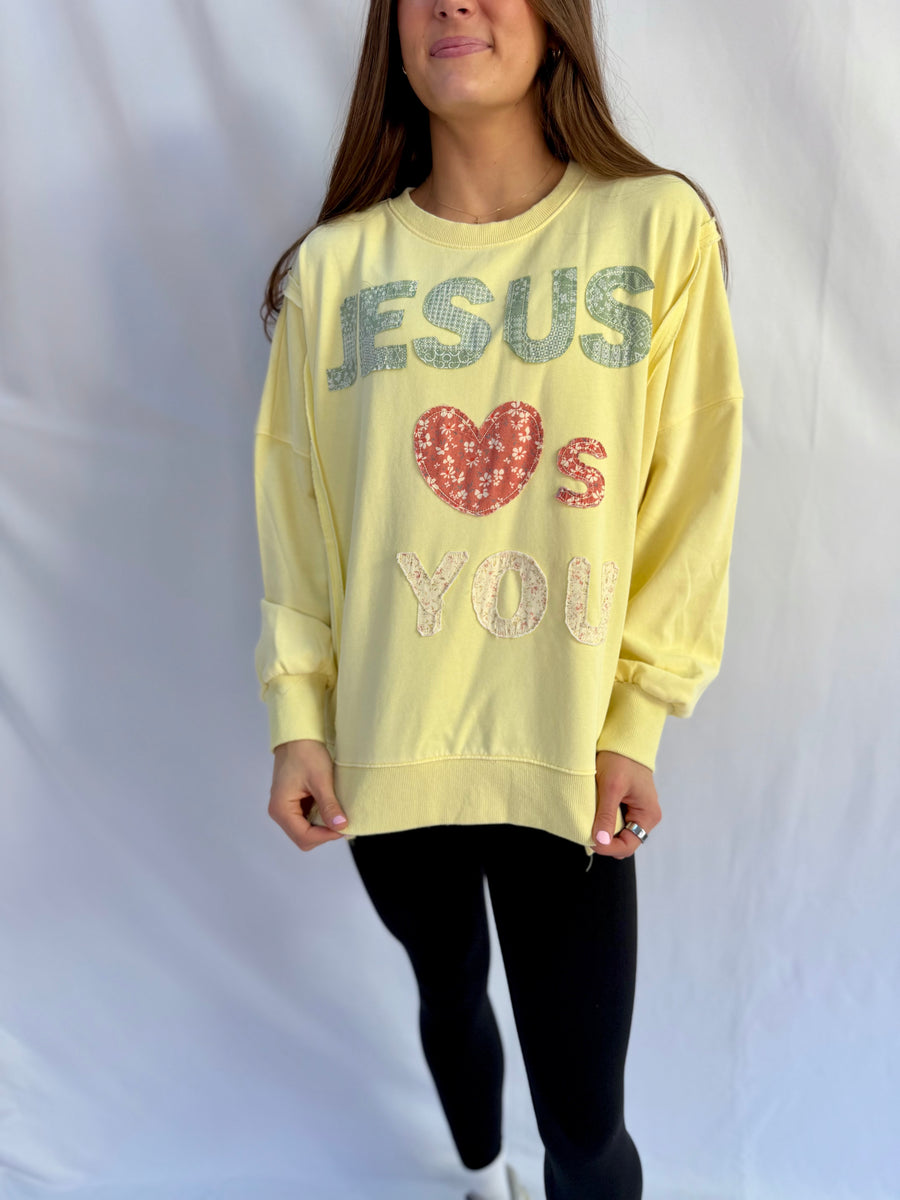 The 15733 Yellow Jesus Loves You pullover features a vibrant patchwork design that combines comfort with a positive message. Wear it to express your faith and brighten your wardrobe, making it a perfect choice for casual outings or relaxed gatherings.