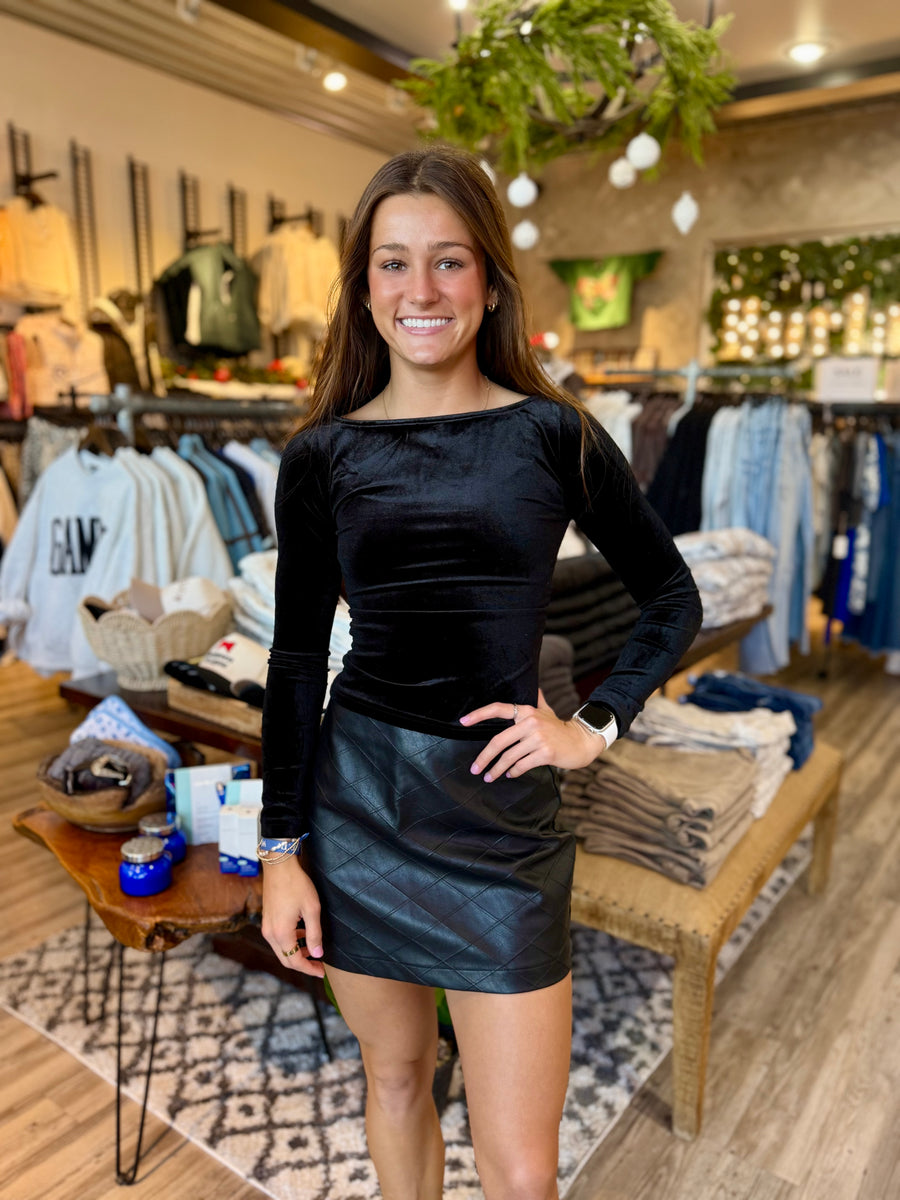 Stay stylish and elegant with our 2069 black velvet long sleeve top. Made with luxurious velvet fabric, this top exudes sophistication and comfort. Perfect for any occasion, be it a formal event or a casual night out. Elevate your wardrobe with this timeless piece. Model seen in size small.
