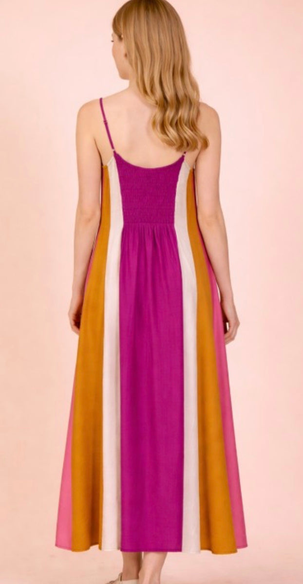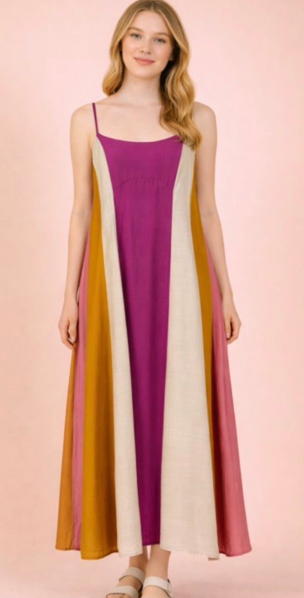 Elevate your wardrobe with the 32081 Magenta Colorblock Stripe Maxi Dress. Its vibrant colorblock design adds a playful touch, while the maxi length ensures comfort and versatility for any occasion. Perfect for summer outings or casual gatherings, this dress combines style with ease.