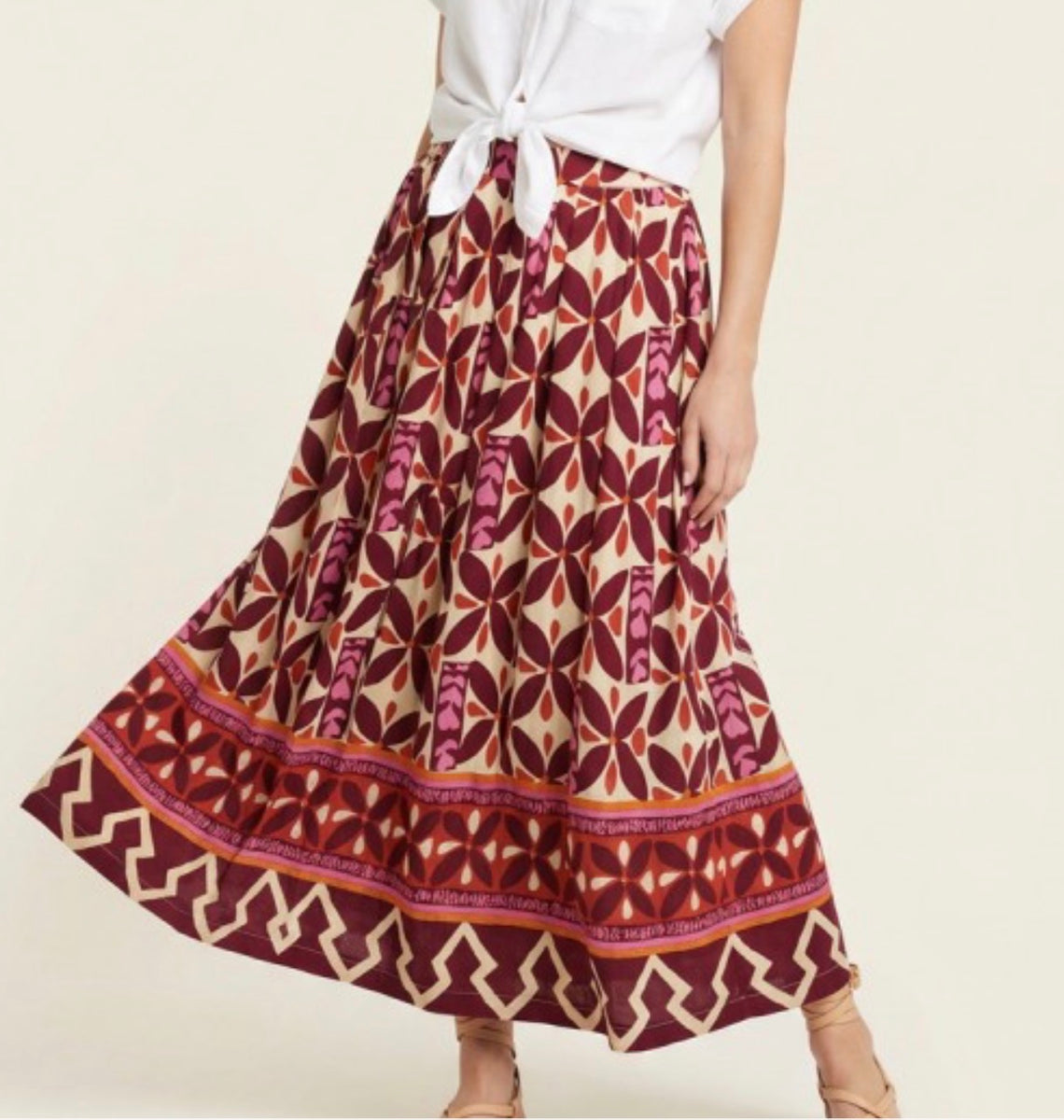 Elevate your wardrobe with the burgundy printed tiered skirt. Its flowy design offers comfort and style, perfect for both casual outings and special occasions. The rich color and patterns make it a versatile piece that can be easily paired with various tops.