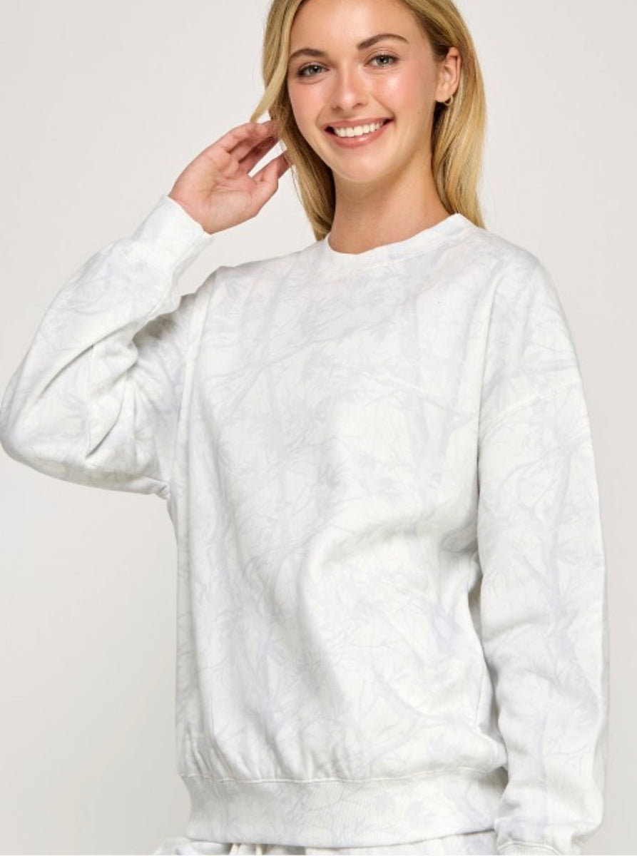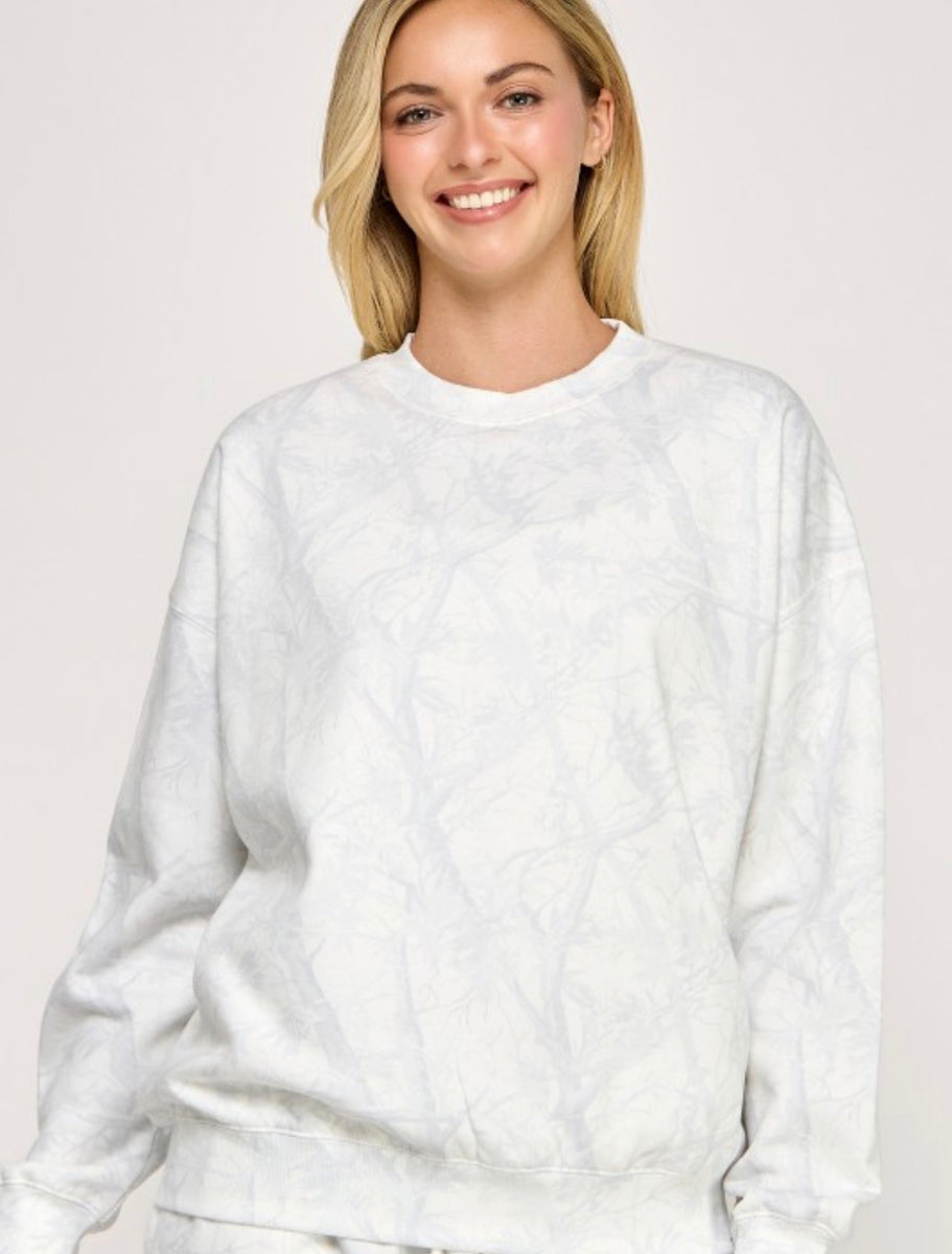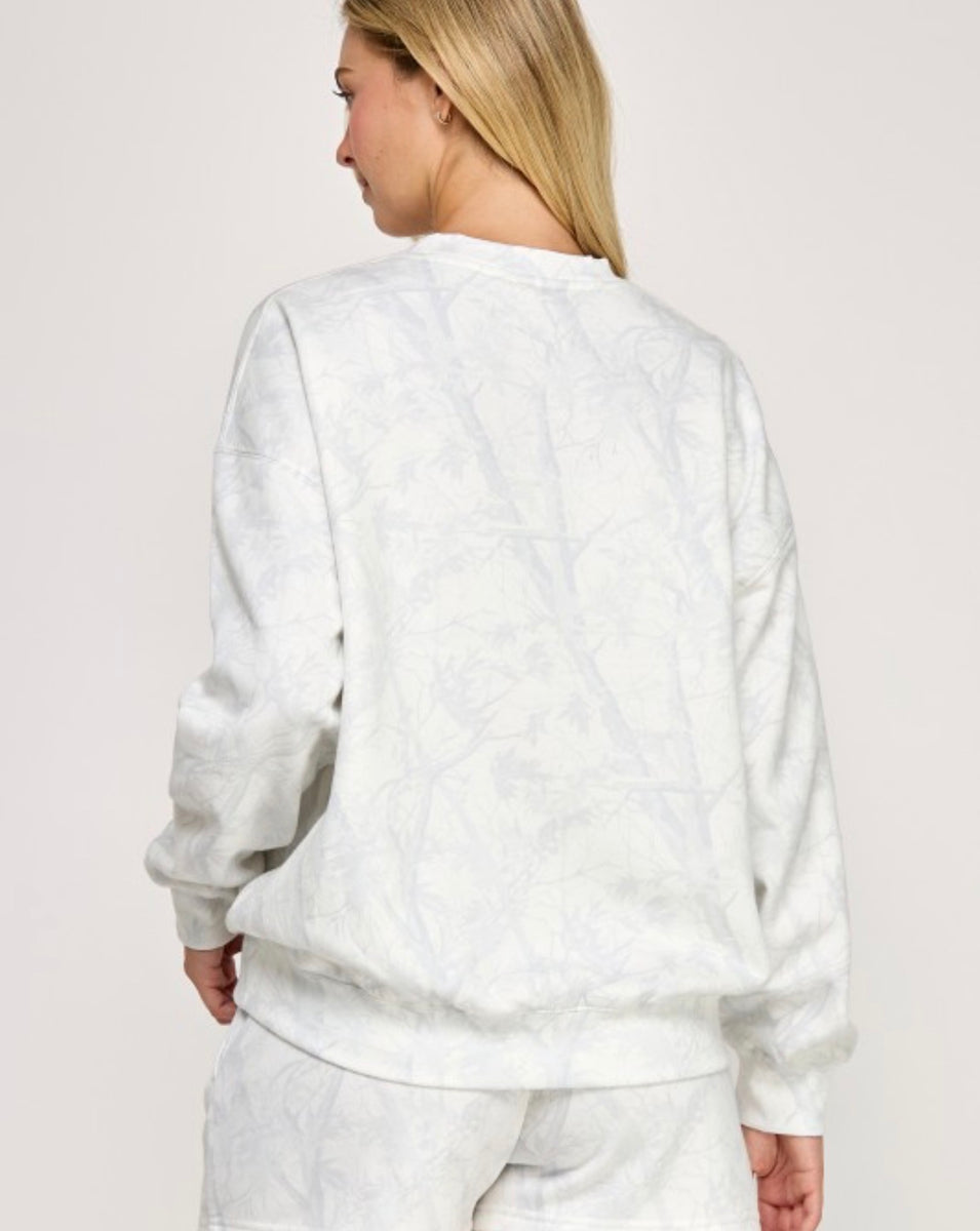 The Relaxed Camo sweatshirt offers a comfortable fit in stylish white or beige camo. Perfect for casual outings, its crewneck design ensures ease of wear, making it a versatile addition to your wardrobe. Enjoy both comfort and a modern look effortlessly.