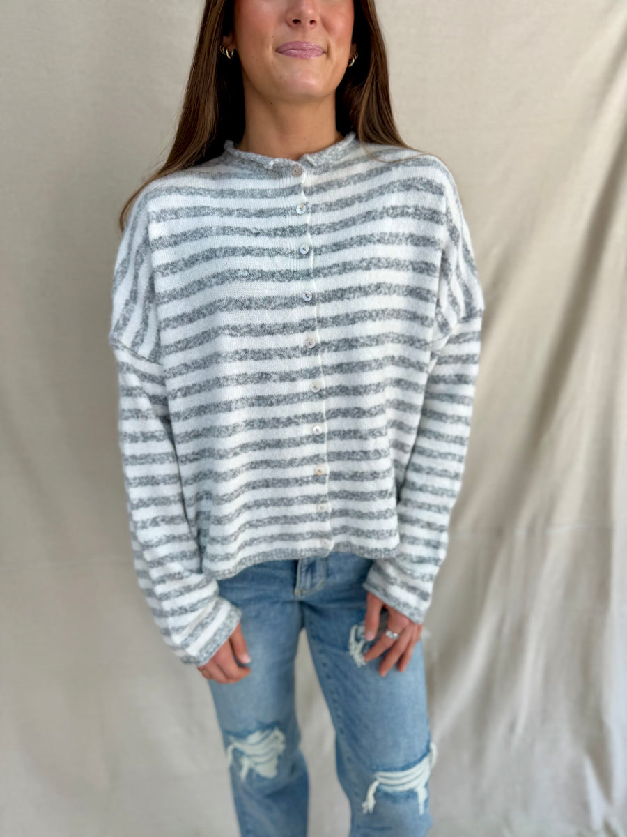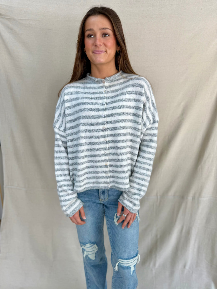 The W1223 cardigan features a stylish ivory and heather gray stripe design, perfect for layering. Its button-down style adds versatility, allowing you to dress it up or down effortlessly. Stay comfortable and chic in this contemporary wardrobe essential.