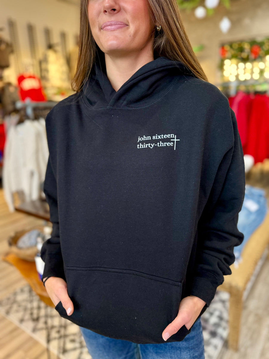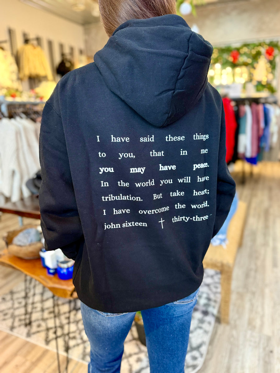 Find peace in our black super thick hoodie with the comforting words of John 16:34. Wrap yourself in comfort and faith with the 'You may have peace' bible verse.